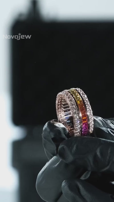 Exquisite rectangular gemstone rainbow band