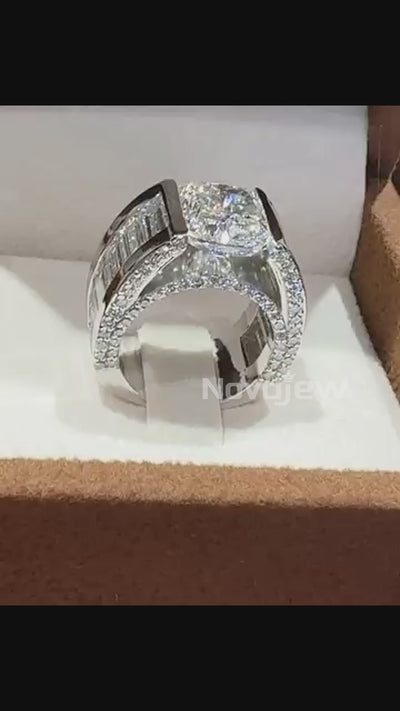 This is a unique and gorgeous design engagement ring that can be worn by both men and women! Set with a combination of sparkling cushion, baguette and round cut white stones. The craftsmanship is exquisitely detailed and sparkling! Comfortable to wear and perfect for many occasions. Total weight is approximately 6 carats.The ring is made of 925 silver throughout, with thick gold plating, which makes the luster last longer compared to other single layer plating. The style is personalized and gorgeous, bringing more possibilities for your fashion collocation.